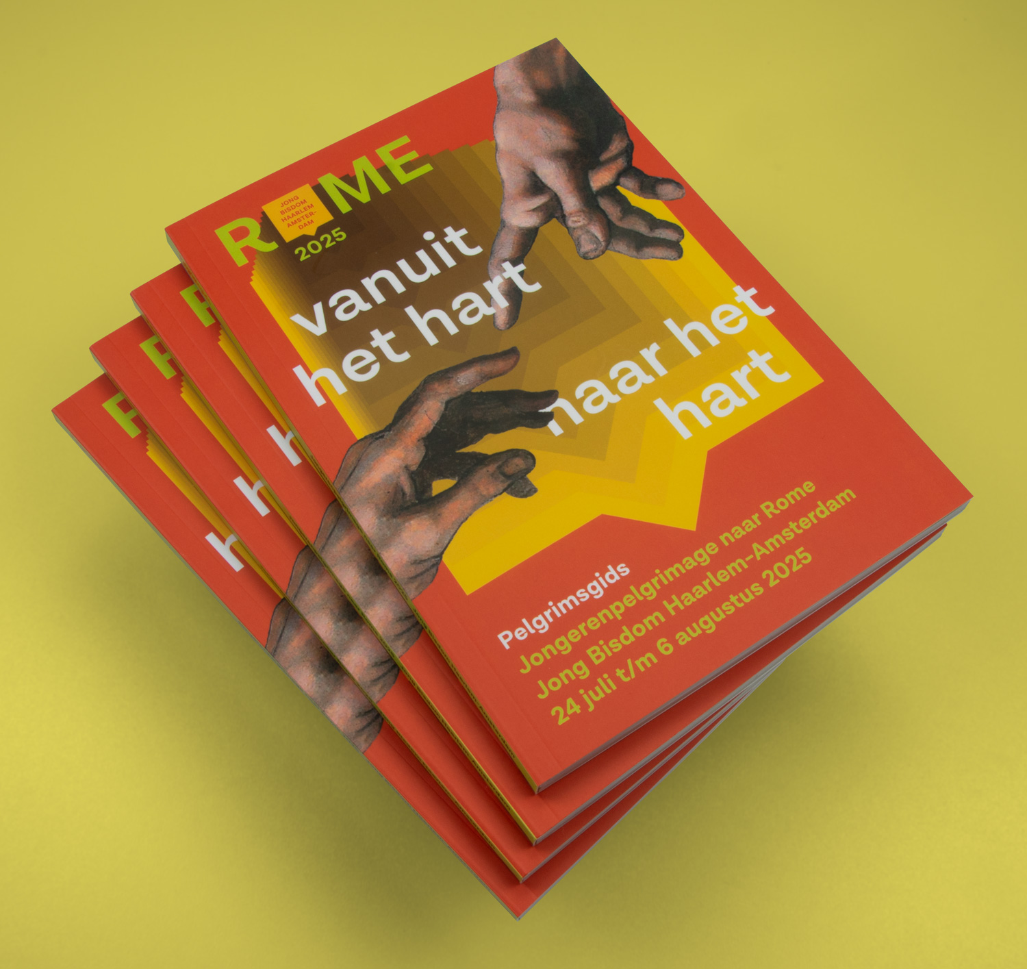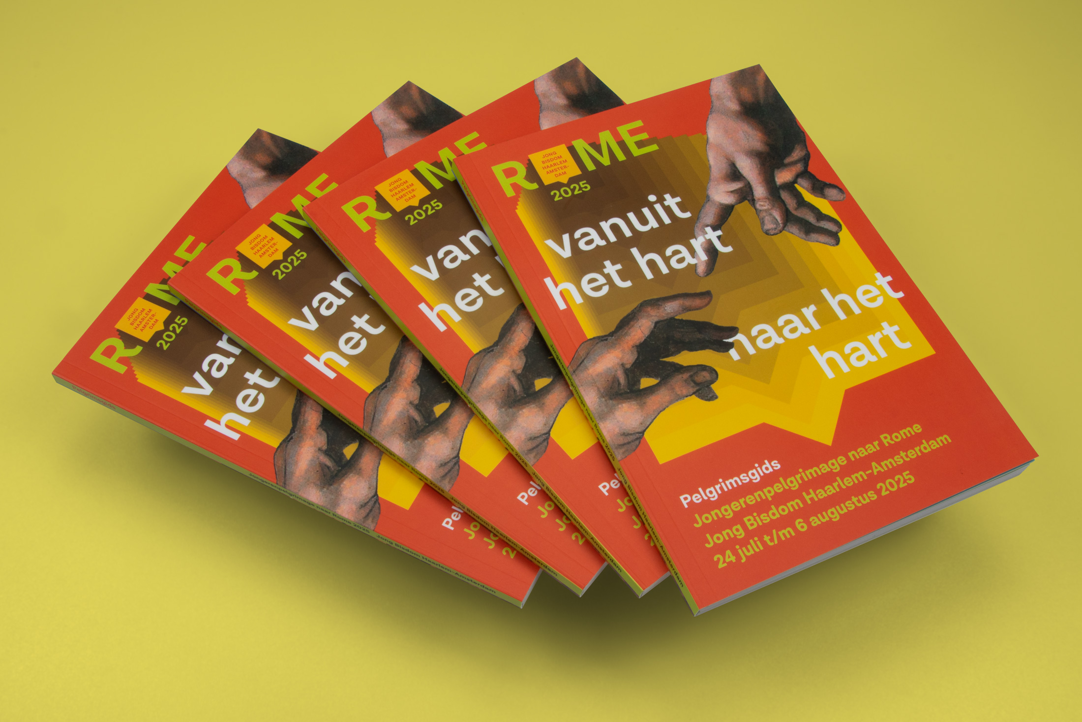 La diocesi di Haarlem-Amsterdam ha organizzato un viaggio giovanile al grande incontro internazionale giovanile a Roma, nell’Anno della Speranza 2025. Nel corso del viaggio ci si è fermato a Paray-le-Monial, Torino, Siena e Assisi, con la Città Eterna come destinazione principale. Era necessaria una strategia e un’identità visiva con un duplice obiettivo: strategia di contenuti, narrazione e promozione e reclutamento in vista del viaggio, e un’identità visiva come elemento aggregante e riconoscibile durante il viaggio.